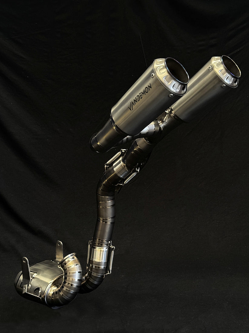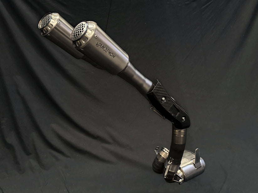 This system seamlessly integrates with the OEM ‘V’ band clamp for a straightforward installation. A carefully tuned non-restrictive pre-muffler reduces harsh frequencies, delivering a deep, resonant exhaust tone that complements the V2’s aggressive engine character.